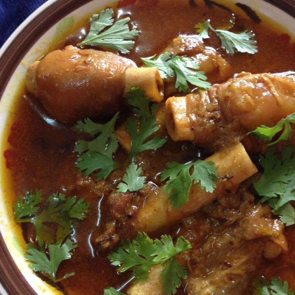 - Slow-cooked goat trotters in a rich, spiced broth